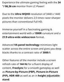 Vendo monitor LC Power modello M34-UWQHD-144-C - 34" Ultra-wide Curved PC Monitor con refresh 144 hz perfetto per gaming o attività di montaggio video / foto. Vendo per cambio a monitor Oled. Ritiro a mano.