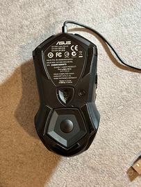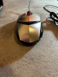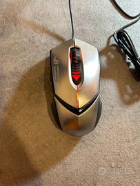 Mouse gaming Asus ROG GX1000 Eagle Eye, connessione USB cablata, con design ergonomico in metallo spazzolato color argento. Sensore laser ottico fino a 8200 DPI, regolabile in tempo reale tramite pulsante DPI laterale. Dotato di 6 tasti programmabili, sistema di pesi intercambiabili e piedini in PTFE per scorrevolezza su ogni superficie. Il click sulla rotella del mouse non funziona più ed è stato impostato su uno dei tasti laterali. Per il resto funziona perfettamente. Venduto con scatola e accessori originali.