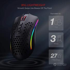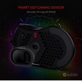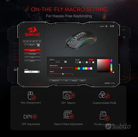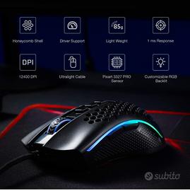 Mouse da gioco Redragon M808 Storm con illuminazione RGB e design ultraleggero. - Guscio a nido d'ape. - Peso di 85 g. - Sensore ottico da 12.400 DPI. - 7 pulsanti programmabili. - Cavo Super-Lite.