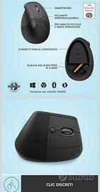 Come nuovo usato pochissimo Marchio Logitech Nome modello Lift Ergonomical Vertical Mouse Colore Grigio Tecnologia di connettività Bluetooth, Logi Bolt , USB Caratteristica speciale Design ergonomico, Leggero, Senza fili Tecnologia di rilevamento del movimento Ottico Tirati su: quando le giornate alla scrivania ti buttano giù tirati su con il Mouse Verticale Ergonomico Logitech Lift, ottimale per mani destre medio-piccole Cambia posizione della mano per più comfort: riposa la tua mano con il mouse verticale Lift per tutto il giorno, con una morbida impugnatura e un comodo appoggio per il pollice per un comfort extra 57 gradi di sollievo: la forma verticale di Lift aiuta a rilassare i polsi e promuove una postura più naturale dell'avambraccio, offrendo comfort e produttività sul lavoro che durano tutto il giorno Rilassati e concentrati: lavora con un mouse wireless per computer che dispone di pulsanti personalizzabili e facili da raggiungere, click silenziosi e una SmartWheel per uno scorrimento fluido Certificato-Ergo: il mouse verticale wireless Lift è stato progettato, sviluppato, testato e approvato secondo i criteri stabiliti dai principali ergonomisti Connettiti a modo tuo: collegati via Bluetooth Low Energy o Logi Bolt USB a Windows, macOS, iPadOS, Chrome OS o Linux e goditi fino a 2 anni di durata della batteria Le parti in plastica di Lift includono plastica riciclata post-consumer certificata (Graphite: 70%,