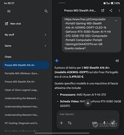 Nuovo in garanzia dal 19 gennaio 2026 valore 3500 euro Vendo a 2150 NON TRATTABILI Processore: AMD Ryzen™ Al 9 HX 370 a 12 core, con Turbo fino a 5,10 GHz, 36 MB di cache NPU TOPS / Prestazioni AI: 50 TOPS Sistema operativo: Windows 11 Home Memoria RAM: 32 GB LPDDR5x - integrata, non espandibile Schermo: 16", 16:10, QHD+ (2560×1600), OLED, 240 Hz, 100% DCI-P3 Scheda grafica: AMD Radeon™ 890M + NVIDIA GeForce® RTX 5080 16 GB GDDR7 Archiviazione: SSD da 1 TB NVMe PCle Gen4×4 Webcam: Tipo IR FHD (30 fps a 1080p) con HDR, Riduzione del rumore 3D+ (3DNR+) Comunicazioni: Wi-Fi 7 + Bluetooth v5.4 Audio: 2x altoparlanti da 2W, 4x woofer da 2W Batteria: 4 celle 99,99 Whr