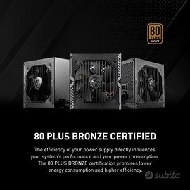 80 PLUS BRONZE CERTIFICATO – Il PSU efficiente riduce il consumo di energia e il carico termico del sistema. Il 80 PLUS Bronze (fino all'87%) è una base solida per l'hardware standard, schede grafiche e le esigenze per la maggior parte del software