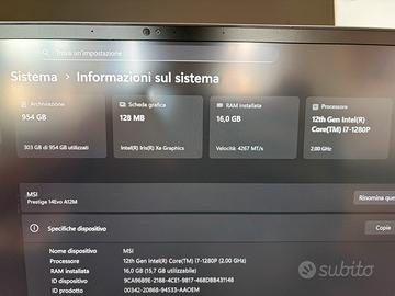 - CPU: Intel Core i7-1280P (14 core/20 threads, 24M Cache, up to 4.80 GHz) - RAM: 16 GB LPDDR4X - 1Tb SSD - Graphic Intel Iris Graphics Xe - Windows 11 Home Perfettamente funzionante, presenta solo delle imperfezioni estiche come da foto, completo di confezione originale e alimentatore compatibile.