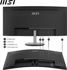 MSI PRO MP341CQ Monitor Curvo 34 UWQHD 3440 x 1440 Prodotto acceso in negozio solo come esposizione. Garanzia 24 mesi MSI PRO MP341CQ Monitor Curvo 34" UWQHD (3440 x 1440), Pannello 21:9, 100 Hz, 1 ms (MPRT), Anti-Flicker, Less Blue Light, Speaker integrati, 2x HDMI 2.0b, 1x DP, VESA 100x100, Nero Be Your Window to the World - La tua finestra sul mondo MSI PRO MP341CQ è un monitor da ufficio curvo 1500R di altissima qualità con un pannello VA da 34" UWQHD (3440x1440). Offre una gamma di colori sRGB di 116,25%, un'alta refresh rate di 100 Hz, contrasto HDR Ready e connettività HDMI e DisplayPort. Il monitor riduce al minimo la distorsione dell'immagine e migliora l'immersione. Minimizza l'affaticamento degli occhi grazie alla tecnologia anti-flicker e alla riduzione della luce blu, e al trattamento antiriflesso della superficie. Schermo curvo 1500R Pannello VA con risoluzione UWQHD (100Hz) e gamma cromatica di livello superiore (116,25% sRGB) Filtri che riducono la luce blu e tecnologia anti-flicker HDR Ready, Kit display MSI supportato Montabile su VESA Inclinazione regolabile Altoparlanti integrati Connettività HDMI 2.0b (CEC) e DisplayPort 1.2a Specifiche del prodotto Display Formato schermo.21:9 Finitura schermo.Opaco Rapporto di contrasto.3000:1 Frequenza di aggiornamento.100 Hz Tipo di schermoVA Indica la tecnologia del monitorVA Viewing Angle178 Gradi Luminosità300 Valore della gamma cromatica116 L'articolo dispone di uno schermo a colori?Sì Tecnologia di miglioramento della qualità delle immaginiAntiriflesso e anti sfarfallio Dimensioni Dimensioni dello schermo34 Pollici Dimensioni dell'articolo, profondità x larghezza x altezza23,7P x 80,9l x 46,9H cm Peso articolo7,7 Chilogrammi Lunghezza del cavo34 Pollici Risoluzione dello schermo Risoluzione dello schermoQHD Ultra Wide 1440p Risoluzione massima del monitor3440 x 1440 Pixel Risoluzione nativa del monitor3440x1440 Prestazioni Tempo di risposta del monitor1 Millisecondi