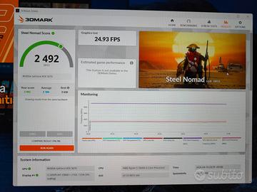 Ha 6GB di memoria invece di 8, e un limite di consumo di 165W. Scheda video in ottime condizioni e perfettamente funzionante, anche se con i limiti descritti. In origine era la migliore 3070 per prestazioni, qualità e dissipazione. Ha prestazioni da RTX 2080 Super o RTX 3060 Ti. Adatta a 1080p o anche 1440p con DLSS. In foto c'è il risultato del benchmark di Furmark 2 e di 3DMark Steel Nomad. Potete confrontarli con le tabelle ufficiali online. In furmark vede anche la temperatura massima raggiunta durante il test. Posso anche mostrare un video come prova del suo funzionamento. Temperature molto basse ed estremamente silenziosa.