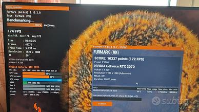 Scheda video RTX 3070 in ottime condizioni e perfettamente funzionante. Adatta a 1440p o anche 4k con DLSS4 senza frame generation Prestazioni uguali o leggermente migliori di RTX 5060 o 4060 Ti Nell'ultima foto c'è il risultato del benchmark di furmark 2. Potete confrontarlo con la tabella ufficiale online: è sopra la media. Si vede anche la temperatura massima raggiunta durante il test. Posso anche mostrare un video come prova del suo funzionamento PREZZO NON TRATTABILE