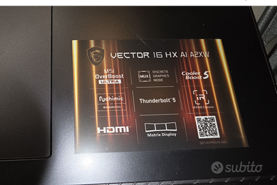 Modello: MSI VECTOR 16 HX AI 4AXW SCHEDA VIDEO Nvidia GeForce --->> 5080 <<--- Acquistato a giugno 2025 dimostrabile, quindi con ancora più di un anno di garanzia Più Garanzia Estesa 2 anni per danni accidentali. Utilizzato sempre con tastiera e monitor esterni Impeccabile, pari al nuovo Utilizzo non intensivo. Caratteristiche: Intel® Core™ Ultra 9 processor 275HX with Intel® AI Boost (NPU) Windows 11 Home Display 16" QHD+(2560x1600), 240Hz Refresh Rate, IPS-Level, 100% DCI-P3(Typical) Intel® Graphics NVIDIA® GeForce RTX™ 5080 Laptop GPU powers advanced AI with 1334 AI TOPS 16 GBV Ram espendibile 1TB*1 NVMe SSD PCIe Gen4 Vendo pari al nuovo, confezione, fattura ed estensione garanzia