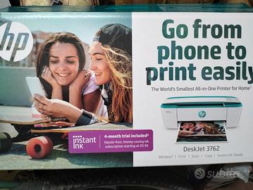 Vendesi stampante wireless multifunzione marca HP mod deskjet 3762 a colori, usata pochissimo con cartuccia originale HP a colori ancora intatta. Si accoppia istantaneamente tramite wireless a tutti i telefonini. Non necessita di alcuna installazione. La attacchi alla presa di corrente e puoi stampare da subito. Ho anche la sua scatola originale.