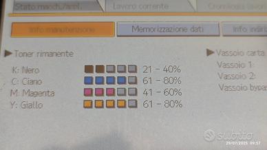 prodotto perfettamente funzionante, in conto vendita, da ufficio dismesso. fotocopiatrice laser b/n e colore, fino al formato A3, stampante laser b/n e colore fino al formato A3. doppio cassetto carta A4 ed A3. interfaccia USB e Lan. monta toner da 20.000 pag cadauno. qualsiasi prova. ritiro e trasporto e installazione a carico dell acquirente. Dimensioni, larghezza 60cm, profondità 70cm, altezza 1,20 MT. Formula vista, provata, e piaciuta. ritiro su Talsano. prezzo non trattabile. non scambio, non spedisco.