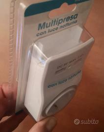 Multipresa con luce notturna, sensore automatico diurno/notturno e switch manuale Auto-Off-On. Spina e presa sono schuko, oltre a 2 porte USB 2.4A. La multipresa ha un 'alloggiamento' superiore dove poter riporre il proprio cellulare durante la carica.