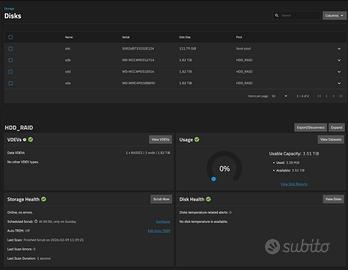 E’ stato installato Truenas ultima versione su un aggiuntivo SSD dedicato, e comprende 3 dischi da 2Tb l’uno in configurazione raid z1. ( è possibile aggiungere anche un quarto disco)
