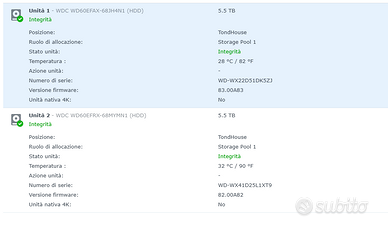 Il NAS viene venduto completo di 2 Hard Disk Western Digital Red da 6 TB ciascuno (totale 12 TB di capacità lorda). I dischi WD Red sono specificamente progettati per l'uso in sistemi NAS 24/7, garantendo affidabilità e prestazioni ottimali. Gli HDD sono in ottimo stato e pronti per l'uso immediato.
