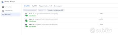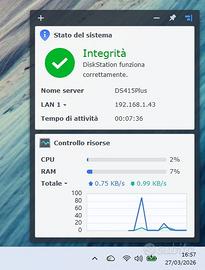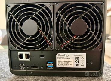 NAS Synology DS415+ con dentro 3 HD installati (su 4) da 2Tb ciascuno. La NAS è sempre stata utilizzata come archivio di consultazione occasionale. È stata cambiata pasta termica del processore, cambiata batteria CMOS e sostituito il modulo di RAM portandolo da 2Gb a 4Gb (modulo Corsair). NAS inizializzata con a bordo ultima versione iOS