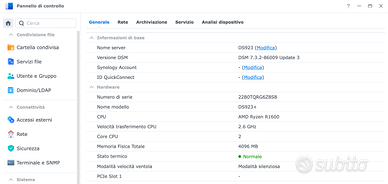 NAS SYNOLOGY DS923+ Vendo causa passaggio a sistema a 16 HD bellissimo NAS SYNOLOGY DS923+ Nas usato sempre come sistema secondario di backup mensile, in ottimo stato e perfettamente funzionante. Vendo con sua scatola e relativi imballi come al momento dell’acquisto, alimentatore, cavo di rete e nell’annuncio non sono compresi i dischi. ✅ Caratteristiche Principali: •CPU: AMD Ryzen R1600 (Dual-core fino a 3.1 GHz). •RAM: 4 GB DDR4 ECC (Espandibile fino a 32 GB). •Slot Disco: 4 vani per HDD/SSD da 3.5" o 2.5". •Cache NVMe: 2 slot integrati per SSD M.2 (per accelerare il sistema). •Rete: 2 porte 1GbE (con supporto failover e Link Aggregation). •Espandibilità: Predisposto per modulo E10G22-T1-mini (10GbE) e unità d'espansione DX517. Ritiro a Clusone consigliato e preferito oppure spedizione in tutta Italia