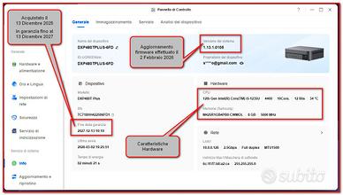 Vendo NAS full SSD con 4 slot NVMe, NUOVO solo testato, acquistato il 13 Dicembre 2025 ed in garanzia fino al 13 Dicembre 2027 come mostrato nella foto del pannello di controllo.