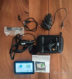 Navigatore Garmin Nuvi 1440, completo di istruzioni, caricabatteria per automobile con spinotto e Usb, caricatore, supporto per aggancio al vetro, custodia in omaggio.