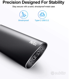Alta velocità: l'unità SSD esterna dotata di interfaccia USB 3.2 Gen 2, fino a 500 MB/s in lettura e 450 MB/s in scrittura ultra veloce.
