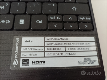 Vendo ottimo netbook, processore Intel atom 1.60GHz N2600, 2Gb RAM, 60Gb HD SSD, 10,1 pollici, molto veloce con Windows 10 installato e attivato.