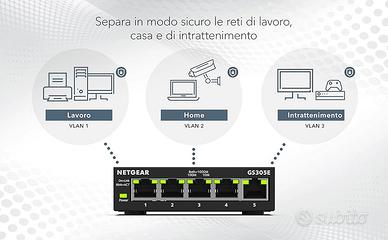 Vendo 3 Switch usati e funzionanti completi di alimentatore: 1 x NETGEAR 5 Port Switch Ethernet GS305 2x NETGEAR 5 Port Switch Ethernet GS305E