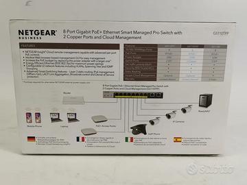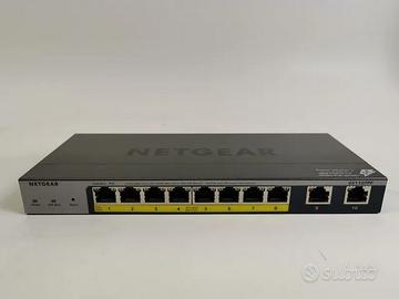Vendo switch di rete Netgear modello GS110TPP, ideale per piccoli uffici, videosorveglianza o reti domestiche avanzate. Si tratta di uno switch smart managed con 8 porte Gigabit PoE+ (alimentano direttamente dispositivi come access point, telecamere IP, telefoni VoIP, ecc.) più 2 porte uplink aggiuntive. Supporta gestione tramite cloud/app Netgear Insight, molto comoda per configurazioni e monitoraggio anche da remoto. Caratteristiche principali: 8 porte Gigabit PoE+ (fino a 30W per porta) 2 porte Gigabit aggiuntive (uplink) Budget PoE elevato (adatto anche a più dispositivi contemporaneamente) Gestione smart (VLAN, QoS, monitoring, ecc.) Compatibile con gestione cloud (Insight) Struttura solida in metallo, funzionamento silenzioso Perfetto per alimentare access point, telecamere o creare una rete stabile senza usare tanti alimentatori.