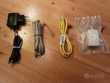 Completo di accessori (modem/router + trasformatore + cavo telefonico + cavo di rete ethernet + filtro).