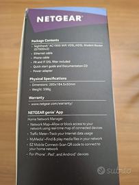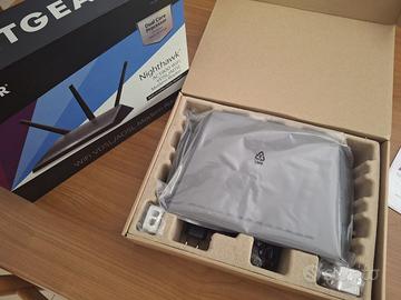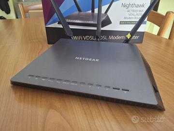 Netgear AC1900 (D7000v2) Modem Router WiFi Dual band Nighthawk. Funziona perfettamente. Vendo perchè sono passato ad operatore con fibra FTTH. Il router in questione è veramente un ottimo prodotto per sfruttare a pieno la tecnologia FTTC ed è completo di una affidabile applicazione per android o apple. Ha un ottima ricezione wi-fi perchè lo usavo in villetta a due piani ed riusciva a soddisfare tutte le zone di casa. Giocando con ps4 o ps5 ho sempre sfruttato al massimo la connessione,senza alcun problema di latenza o disconnessioni. Il prodotto è come da foto; scatola originale con tutti i suoi accessori in dotazione.