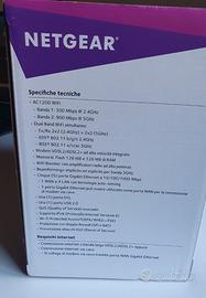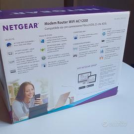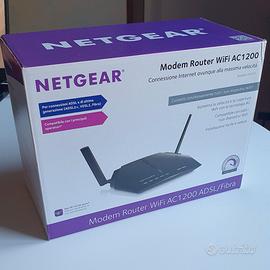 Modem Router WiFi NETGEAR in ottime condizioni. Perfetto sia per connessione ADSL che di ultima generazione (fibra). Compatto e di dimensioni modeste, è provvisto di involucro originale con all'interno cavo ethernet, cavo telefonico, filtro DSL (per IT), guida rapida e alimentatore.