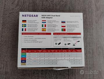 Adattatore wireless dual band USB N600 NETGEAR usato pochissimo in perfette condizioni completo di scatola, cavi e istruzioni originali.