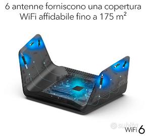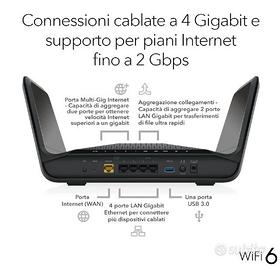 NETGEAR Nighthawk Router WiFi 6 (RAX70), Dual-Band Velocità Wireless AX6000 (fino a 6.6 Gbps), Copertura fino a 175 m2 WIFI 6 - STREAMING DI QUALSIASI CONTENUTO A OTTIME VELOCITÀ: streaming simultanei e senza interruzioni di film, giochi, videochiamate o download/trasferimento di file con velocità WiFi a 6,6 Gbps. IDEALE PER CONNESSIONI FTTH (Fiber to the Home): sostituisci il tuo modem router WiFi esistente utilizzando un dispositivo ONT. Questo modello non ha il modem incluso quindi per connessioni DSL o VDSL è necessario collegarlo in cascata al modem principale. FACILITÀ DI CONFIGURAZIONE E GESTIONE: si connette al modem via cavo esistente e grazie all'app Nighthawk è possibile configurarlo e personalizzarlo in pochi minuti. Gestisci in tutta semplicità le impostazioni WiFi a livello di dispositivo e di rete, effettua un test della velocità Internet, guarda la cronologia della velocità e monitora l'utilizzo dei dati. CONNESSIONI USB: consente di condividere un'unità di archiviazione con qualsiasi dispositivo connesso, e di creare un'archiviazione cloud personale per l'accesso da qualsiasi luogo, utilizzando la porta USB 3.0. PORTE ETHERNET CABLATE: collega computer, console di gioco, lettori di streaming e altri dispositivi cablati nelle vicinanze con le 4 porte Ethernet a 1 gigabit. CARICATO CON TECNOLOGIA AVANZATA: progettato con processore Quad Core da 1,5GHz, OFDMA, MU-MIMO, Dynamic QoS, 1024-QAM, Smart Connect per un unico nome WiFi, tecnologie Beamforming, controllo vocale Amazon Alexa e Assistente Google. Supporta i protocolli di sicurezza wireless WPA2/WPA3. Si preferisce consegna a mano zona Padova ma posso spedire.