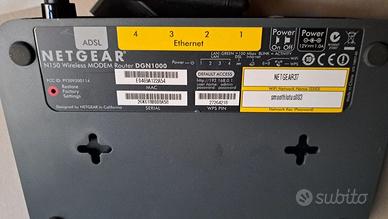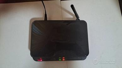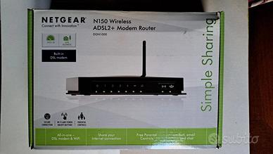 NETGEAR Router Wireless DGN1000 N150 4 Porte 10/100 Switch a 4 porte, Banda di frequenza 2.4 GHz, Wireless e cablato. Protezione firewall, Supporto NAT, Stateful Packet Inspection (SPI), prevenzione da attacchi DoS (Denial of Service), passthrough VPN, supporto Wi-Fi multimediale (WMM), registrazione eventi, Wi-Fi Protected Setup (WPS). Interfacce4 x rete - Ethernet 10Base-T/100Base-TX - RJ-45 ¦ 1 x modem - ADSL2 - RJ-11 ( WAN ). Questo router wireless 802.11n aggiunge alla vostra rete considerevole potenza e flessibilità. Cinque prodotti in uno, combina modem ADSL, router, switch per LAN 10/100, access point 802.11n e doppio Firewall SPI. Consente di condividere l'accesso a banda larga con tutti i computer collegati in rete in modo wireless o utilizzando i cavi Ethernet. Con la sua alta velocità wireless 802.11n fino a cinque volte più veloce di 802.11b – permette di scaricare grandi file, utilizzare la videoconferenza, distribuire e riprodurre filmati digitali di alta qualità, fotografie e file MP3s in un batter d’occhio. Semplice da usare, si connette direttamente alla vostra linea ADSL. Questo modello è compatibile con NETGEAR Genie per una gestione della rete semplice attraverso smartphone e tablet in tutta comodità.
