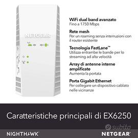 Vendo per cambio modem router, NETGEAR EX6250 ripetitore Wi-Fi Mesh dual-band AC1750 progettato per estendere la copertura della rete domestica esistente, ideale per lo streaming 4K e il gaming. Può estendere la copertura Wi-Fi fino a circa 139 m² e supportare fino a 25 dispositivi contemporaneamente. Include una porta Gigabit Ethernet per collegare un dispositivo cablato (come PC, console o Smart TV) per connessioni stabili e veloci. Prezzo trattabile.