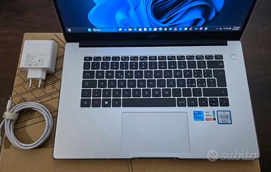 Notebook Huawei Matebook D 15,computer pari al nuovo usato pochissimo,colore Mystic Silver,cover protettiva trasparente full boby completa su entrambi i lati,è stata messa appena comprato,processore intel Core I5,grafica Gpu intel Iris Xe Graphics,Ram 8 GB,SSD 512Gb,lettore d'impronte digitale,sistema operativo windows 11,completo di scatola,cavo e caricabatterie originale huawei tipo-c 120W.
