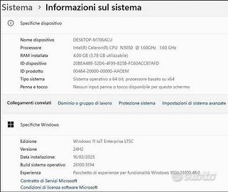 Appena ricondizionato da un tecnico informatico qualificato con pulizia interna e sostituzione pasta termica CPU/GPU,batteria NUOVA acquistata da Amazon,montaggio SSD nuovo da 128GB e installazione Windows 11 Enterprise 24H2(l'ultima versione)+Microsoft Office 2024 Professional Plus aggiornati ed attivati a vita.