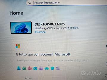 Vendo perché ho appena fatto upgrade, notebook Asus VivoBook model X509FA (x509FA-BR066T) Perfettamente funzionante, buone condizioni generali, graffietti sparsi e normale usura del tempo. Caratteristiche Tecniche principali: monitor: 15,6” - risoluzione 1366 x768 pixel cpu: intel core i5 di 8th -8265U, 4 core – 8 thread ,frequenza base configurata@1.8 GHz anziché 1.6GHz dal produttore/ turbo 3.9 GHz (pasta termica appena sostituita) vga: integrata intel UHD 620 ram: 8 gb ddr4 (4gb saldati +1 modulo da 4gb) ssd: Sata III 6Gb/s -- PNY CS900 250 Gb (presente nel pc, slot interno per mettere ssd NVme) wi-fi : Realtek 8821CE Wireless Lan 802.11 Ac batteria: capacità residua 65% (usura con software HWinfo è al 35%) -dura 2ore circa, dipende da utilizzo Alimentatore: originale presente S.O. Windows 11 Dotato di Web Cam e microfono integrati funzionanti Solo scambio a mano Catania e dintorni Non spedisco – No perditempo Per maggiori info o foto contattatemi tramite chat di Subito.