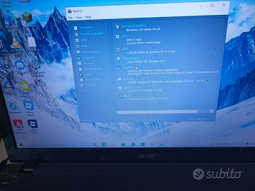 Notebook Acer Aspire 5250 con qualche difetto presente in descrizione. Funziona perfettamente, in buone condizioni ma con piccoli difetti da evidenziare (visibili in foto): Piccoli segni dovuti all'uso, la tastiera (ITA) è un po' consumata, le lettere sono visibili, funzionano tutti i tasti tranne il tastino (freccia su) che è bloccato. Schermo retroilluminato led 15.6" HD con webcam integrata, ha un lieve alone/macchia che si intravede solo guardando dall'alto verso il basso (ho cercato di visualizzarlo in foto 6), scritto per correttezza non influisce affatto sulla visione dell'immagine su monitor. utilizzandolo normalmente in posizione frontale non si vede alcun difetto. Processore AMD E-450 con APU 1650 MHz RAM DDR3 6GB (16GB max) Scheda grafica Radeon HD 6320 con oltre 1860 MB di memoria dedicata. Hard disk 500GB (SSD consigliato non incluso) Batteria presente con poca autonomia (30 - 45 minuti in via di esaurimento). Masterizzatore DVD, lettore di schede SD, USB, audio-mic, VGA Windows 10 pro 64 bit, diversi programmi utility e Office già installati. Giochi passatempo, puzzle, spara bolle, Minecraft, Roblox. NVIDIA GeForce Now. Chrome, VLC, Acrobat Reader e quant'altro. Portatile ideale per un uso casalingo, social, musica, video, ufficio e scuola. Si vende solo al prezzo esposto e ne tiene conto dei pregi e difetti come sopra citati. Offerte al ribasso non accettate! Foto attuali e originali. Alimentatore incluso.