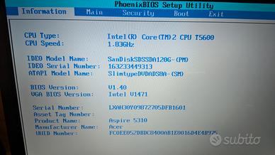 Notebook Acer Aspire 5310, in ottime condizioni e perfettamente funzionante. Aggiornato con CPU Intel Core 2 T5600 1.8GHz, 2gb ram, HDD 80 gb, Nessun sistema operativo installato. Display WXGA da 15.4" (risoluzione 1280x800), Il laptop include un lettore DVD, connettività Wi-Fi b/g, 4 porte USB 2.0 e un lettore di schede 5-in-1. È incluso l'alimentatore.