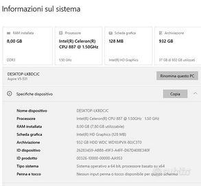 Notebook Acer Aspire V5-531, CPU Celeron 1,5 Ghz, Ram 8 GB, HD 1 Tb, lettore CD, 3 porte USB, WiFi, monitor 15.6”, Windows 10.