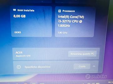 vendo notebook Acer davvero in ottime condizioni estetiche con CPU Intel i3,RAM 8gb,SSD 128gb molto reattivo quasi mai usato. masterizzatore, webcam,wifi, bluetooth con win 11 perfetto..originale...solo ritiro a mano su bari..no spedizione