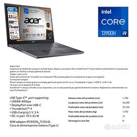 Acer Aspire15 Limited Edition, Notebook Intel Core i9-13900H, Raptor Lake, Ram DDR5 32Gb, SSD Pcie 1Tb, Display 15,6" FHD IPS BlueLightShiled, Tastiera retroilluminata, fingerprint, thunderbolt, Win 11, pronto all'uso Altre caratteristiche USB Type-C™ port supporting: • USB4® 40Gbps • DisplayPort over USB-C • Thunderbolt™ 4 • USB charging 5 V; 3 A • DC-in port 19 V; 65 W Tipo di batteria 50Wh Li-ion battery, weight 208 g Descrizione Sitema Operativo Windows 11 Home Tipo di monitor LED Display antiriflesso Con display antiriflesso Ingressi microfono 1 Ingressi audio 1 Lettore impronte digitali SI Numero porte Thunderbolt 1 TPM 2.0 Con TPM 2.0 Capacita\' SSD- 1 Terabyte Pci Nvme 4x Tipo di RAM DDR5 Capacità RAM in GB 32 DDR5 4800 MHz Processore Intel Processore Intel Core i9 Velocità clock Turbo (Ghz) 5,400 Generazione Intel Processore Intel® Core™ i9-13900H Modello scheda grafica Iris Xe Eligible Graphics Nessuna unità ottica Bluetooth 5.3 HDMI Uscita audio Capacità batteria-celle 3 Wireless integrato Intel® Wi-Fi 6E Wireless LAN Protocollo Wi-fi Wireless 802.11 ax Tastiera italiana QWERTY retroilluminata con tastierino numerico Videocamera incorporata FHD USB Camera Microfono integrato Dimensione schermo (pollici) 15,6 Profondità-mm 237,500 Altezza-mm 17,900 Larghezza-mm 362,900 Peso-Kg 1,77