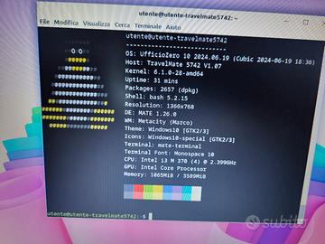 vendo notebook come da foto. Acer Travelmate 5742. pc con cpu I3, 4gb di ram, hd 250gb. il PC era aziendale ed è stato dismesso. verificato in tutte le sue parti e eseguito upgrade ram da 2 a 4gb. per il test è stato installato ufficio zero v. 10 (distro basata su Debian ) in fase di acquisti rimuovero' il sistema è lascerò il disco vuoto. ottimo come PC di appoggio. viene venduto con la formula visto e piaciuto. restituzioni non accettate. prezzo 130 euro (trattabili). spedizione a carico dell'acquirente