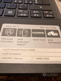 Notebook Acer ES1 - 131 - C708 con sistema operativo Windows 11 con licenza Microsoft attiva. SSD eMMC da 32GB estendibile con SD. Usb3 HDMI, webcam integrata . Perfettamente funzionante! NON RICONOSCE LA BATTERIA. COMPLETO DI CARICABATTERIE. Per postazione fissa. Piccolo leggero e veloce