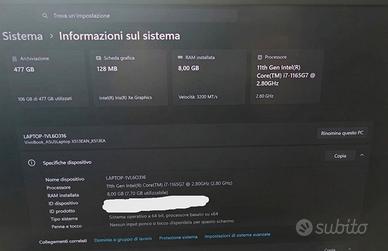 Vendo ASUS VivoBook 15 (modello K513EA-L12251W ) acquistato nel giugno del 2022 e tenuto in condizioni eccellenti, praticamente come nuovo. Il computer è perfettamente funzionante, veloce e molto leggero, ideale per studio, lavoro, ecc. Specifiche tecniche •Processore Intel Core i7-1165G7 (11ª generazione) •8 GB RAM (Con sovraprezzo è possibile portare il Pc a 20 gb di memori Ram) •SSD 512 GB •Schermo 15.6” Full HD Oled •Grafica Intel Iris Xe •Sistema Windows 11 Home Inclusi: •Caricatore originale •Scatola originale N.B. Cira un anno fa è stata sostituita la batteria. Preferisco consegna a mano, ma posso valutare anche spedizione. Per qualsiasi informazione scrivimi pure senza problemi. Disponibile per qualsiasi prova prima dell’acquisto.