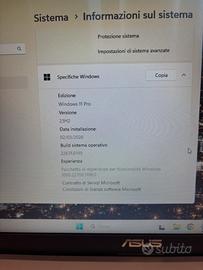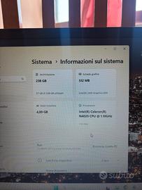 Vendo computer portatile ASUS (modello X515MA) in ottime condizioni estetiche e perfettamente funzionante. È un laptop dal design elegante, color argento, leggero e pratico. È il computer ideale per la navigazione web, l'uso di programmi da ufficio (pacchetto Office, email), la scuola/università o per guardare film e serie TV. Specifiche Tecniche: • Sistema Operativo: Windows 11 Pro (Ultima versione 23H2 installata) • Processore: Intel Celeron N4020 @ 1.10GHz • Memoria RAM: 4 GB • Archiviazione: 256 GB SSD (Nelle impostazioni visibili 238 GB utilizzabili). L'SSD garantisce un'accensione rapida del PC e un caricamento veloce dei programmi. • Scheda Grafica: Intel UHD Graphics 600 • Schermo: Display con tecnologia "NanoEdge" a cornici sottili per un'esperienza visiva più ampia. • Tastiera: Layout Italiano (QWERTY) estesa, comoda e con tastierino numerico laterale. • Audio: Sistema ASUS SonicMaster per un suono nitido e pulito. • Extra: Dotato di porta HDMI, design estremamente portatile e batteria ottimizzata per una lunga durata. Condizioni: Il PC è usato ma tenuto molto bene, come si può vedere dalle foto. Non presenta danni strutturali o graffi profondi sul display. includo il caricabatterie originale Disponibile per qualsiasi prova. Consegna a mano in zona cassino o spedizione a carico dell'acquirente. Per altre info, contattatemi!