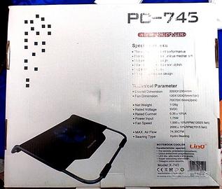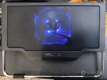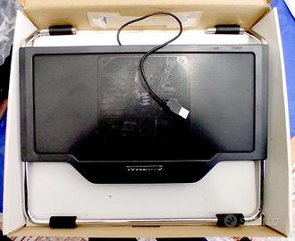 Notebook Cooler raffreddamento da tavolo per portatili.Supporto in acciaio con antiscivolo e ventilatore con led spia e interruttore.Due porte USB e cavo alimentazione USB in dotazione.Usato poche volte e nello scatolo originale.