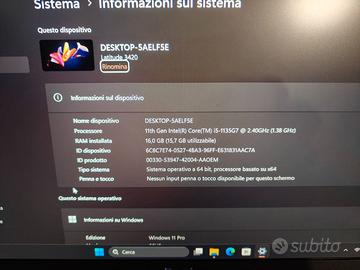 Notebook Dell 3420 14" Intel core i5 11° Ram 16Gb Tastiera retroilluminata SSD 240Gb Alimentatore Originale Buone condizioni estetiche Ultimo rimasto di questo modello