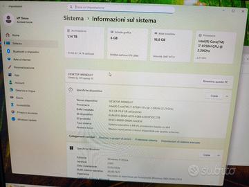 Come da titolo vendo eccezionale computer portatile marca HP OMEN, marchio di Elite specifico per gaming. Il pc è una scheggia, accensione e spegnimento in circa 2 secondi. Costruito secondo standard militari. il pc è compatto e leggero e anche molto potente. Processore Intel i7 8750H con ben 6 cores e 12 threads, vorrei soffermarmi su questo processore che è il primo processore intel su base mobile che è un esacore, cioè con 6 cores e 12 threads. ha infatti un punteggio di circa 20000 su passmark, che è ben più alto di tutti gli altri processori mobili. uno dei pochissimi processori mobili che dà soddisfazioni pari alle versioni desktop. Una scheggia. GPU DOPPIA INTEGRATA Intel UHD Graphics e Scheda video dedicata NVIDIA RTX 2060 con 6 giga di VRAM dedicata. La peculiarità della doppia scheda video è proprio la possibilità di poter risparmiare energia quando non c'è bisogno di prestazioni elevate. Tastiera retroilluminata RGB con tante possibilità di personalizzazione 16 GB di Ram espandibili SSD da 256 GB ( Velocissimo, 1800 MB/Secondo per quanto riguarda la lettura e 1100 MB/secondo per la scrittura. Pochi SSD sono più veloci di questo) + Hard Disk da 1 TB Schermo LED da 15.6 Pollici 144 Hz FULL HD 1920 x 1080 Audio Bang & Olufsen di ottima qualità, molto pieno e potente Ampio touchpad multitouch con le gestures per scrolling e altro Casse stereo 3 porte USB 3.0, una porta usb Type C 3.1. Una porta HDMI full size, porta ethernet HD webcam, bluetooth , wifi e porta ethernet Vendo ovviamente con alimentatore originale. Il pc è come nuovo, ed ha prestazioni eccellenti. prezzo non trattabile! Possibile aggiunta di borsa da pc con 20 euro in più. Possibile spedizione in tutta italia. Per qualunque informazione non esitate a contattarmi!