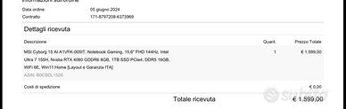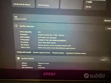 Vendo stupendo notebook da gaming ultima generazione ram installata 64 gb oggi impossibile da fare visti i prezzi Pagato 1500 ancora pggi su amazon a 1200 euro con 8 giga di ram Fattura di acquisto nelle foto , prezzo prima di mettere pe ram. Solamente persone interessate che capiscano di componenti di qualita grazie MSI Cyborg 15 AI A1VFK-005IT, Notebook Gaming, 15,6" FHD 144Hz, Intel Ultra 7 155H, Nvidia RTX 4060 GDDR6 8GB, 1TB SSD PCIe4, DDR5 16GB, WiFi 6E, Win11 Home Nero Dimensioni dell'Hard-Disk1 TB Sistema operativoWindows 11 Home Caratteristiche prodotto1TB SSD PCIe 4, Portatile ad altissime prestazioni con Processore Intel Core Ultra 7 155H e Nvidia GeForce RTX 4060, GDDR6 8GB, Ram 16GB (2x8GB) DDR5, Tastiera retroilluminata a 4 zone RGB, Webcam posizionata nella parte superiore del portatile Graphics DescriptionRTX 4060 Graphics CoProcessorIntel Iris Xe Graphics Hard Disk Technology1TB NVMe PCIe SSD Gen4x4, 1TB NVMe PCIe SSD Gen4x4 Peso articolo1,98 Chilogrammi Produttore processore graficoNVIDIA Usi specifici per il prodottoEntertaniment, Gaming, Studente Funzionalità webcamSì Graphics RAM Size8 GB Software aggiuntiviMSI Center Fattore di formaNotebook Tipo di interfaccia dell'Hard-DiskPCIE x 4 Descrizione della fotocameraAnteriore Graphics RAM TypeGDDR6 Dispositivi compatibiliCuffie, Monitor, Mouse, Tastiera Tipo di garanzia2 Anni Fabbricante Dimensioni dell'articolo, lunghezza x larghezza x spessore35,9L x 25l x 2,3Gio cm Tipo di chipsetIntegrato Tipo di periferiche otticheNo Dispositivo di alimentazioneAC adapter Uscita videoHDMI, Type-C DisplayPort