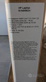 Vendo causa doppione, nuovo ancora nella sua confezione. Intel i5-1334U SSD 1TB 16GB RAM SDRAM DDR4 Schermo LED 15.6'' Un laptop realizzato per mantenere alta la tua concentrazione: Grazie al laptop HP 15,6" la tua produttività salirà alle stelle con un potente processore Intel, ampio spazio di storage e un'efficiente scheda grafica, il tutto incorporato in un design elegante ed ecosostenibile. È realizzato con plastica potenzialmente destinata agli oceani e plastica riciclata post-consumo, per la massima produttività nel rispetto dell'ambiente. Progettato per una connettività costante: HP True Vision Camera con otturatore per la privacy, due microfoni, riduzione del rumore avanzata: tutto quello di cui hai bisogno per una collaborazione perfetta. Massima produttività, ogni giorno: Con un potente processore Intel, ampio spazio di memoria e di storage e connessioni veloci, la produttività e l'efficienza sono sempre assicurate. Produttività al passo con la tua creatività: Un dispositivo con certificazioni EPEAT Golded ENERGY STAR, dotato di un display HD da 15,6".