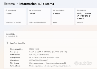 Notebook HP Probook 430 Notebook perfettamente funzionante e con scocca perfetta. Caratteristiche: Modello: J4T50EA Processore Intel i7 4510U quarta generazione Ram 8GB DDR3 Scheda video Intel HD 112MB DISPLAY da 13' Disco Fisso SSD 250 Gb Wireless, Bluetooth, USB 3 porte, HDMI, VGA. Batteria perfettamente funzionante e possibilità di qualsiasi prova di utilizzo. Potete contattarmi via e-mail o whatsapp per qualsiasi dubbio.