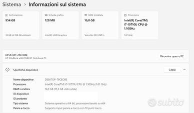 Vendo notebook 2 in 1 convertibile tablet touchscreen a 360 gradi HP Elitebook X360 1040 G7 in ottime condizioni, come da screenshot in allegato l'SSD ha solo 4TB scritti (dichiarato per 1000TB) e la batteria 130 cicli di ricarica, con un autonomia di circa 6 ore. Unico difetto un angolo leggermente segnato come da ultima foto.